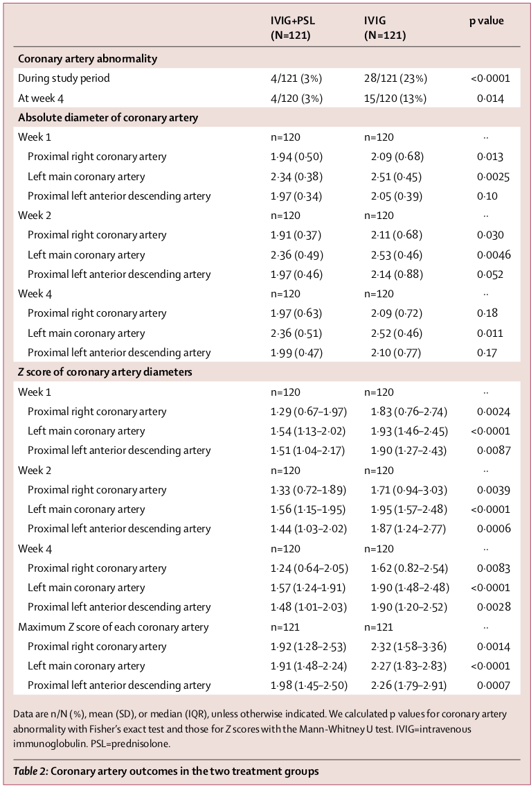 アウトカム: 冠動脈異常頻度は有意にPSL群で低い