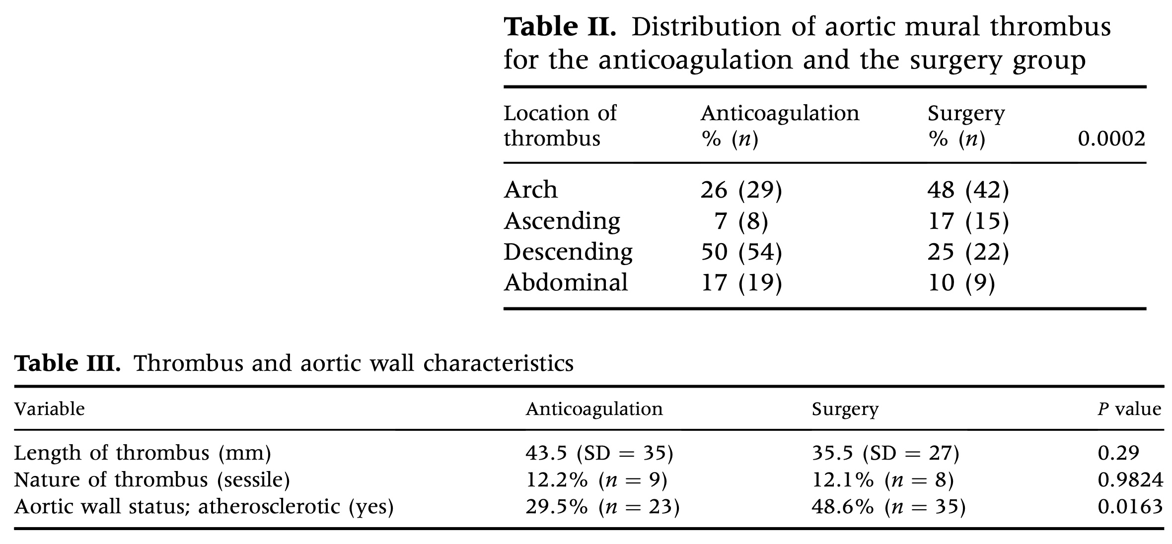 ・持続性, 再発性の壁在血栓は 抗凝固薬治療群で26.4%, 外科手術群で5.7%で認められた. p<0.001